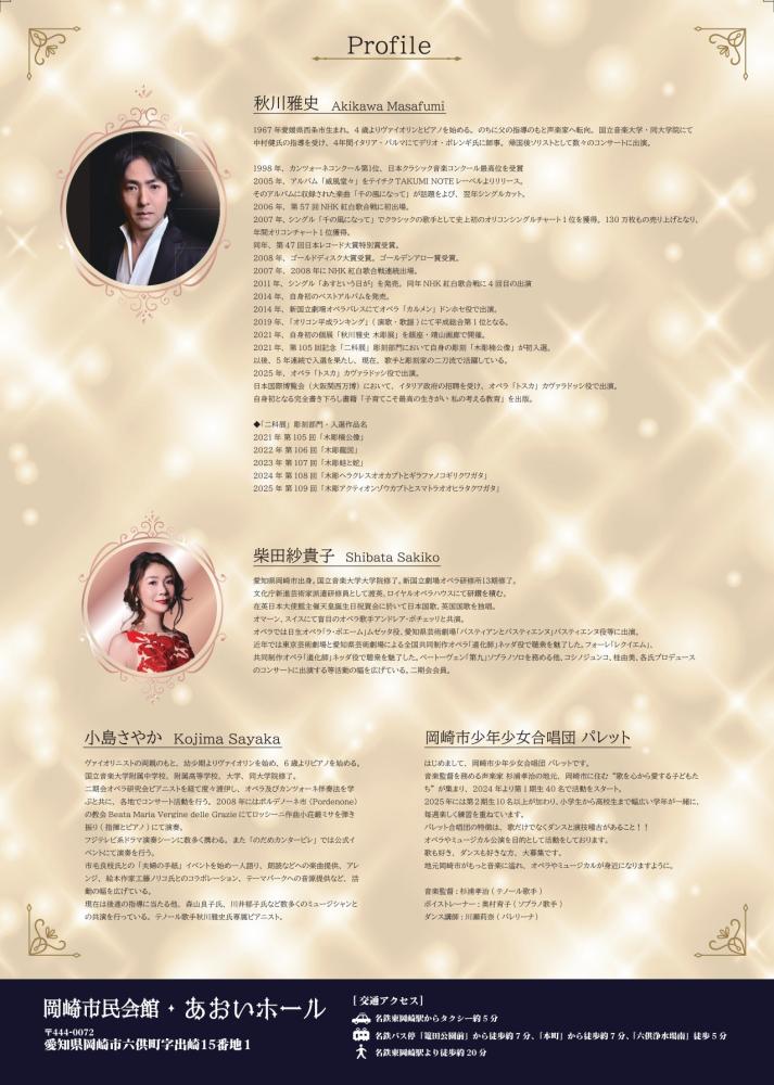 「千の風になって」で御馴染みの、テノール歌手・秋川雅史 さんと岡崎市出身のソプラノ歌手 ・柴田紗貴子 さん、ピアノ・小島さやか さんによるコンサートです。