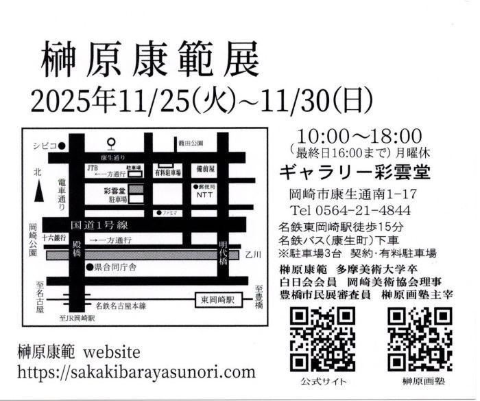 岡崎市出身の画家・榊原康範さんの展示会が、彩雲堂ギャラリーで開催されます。